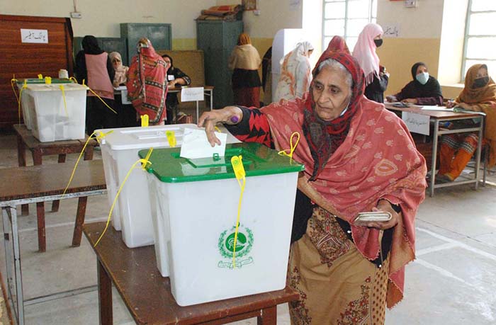 SIALKOT: February 08 – A voter casts her vote in a ballot box in a polling station during General Elections -2024. APP/MUT/MAF/TZD/ABB
