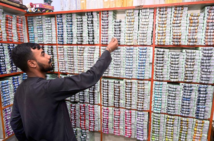 LARKANA: March 05 – A shopkeeper displaying artificial jewelry to attract the customers. APP/NAS/ABB