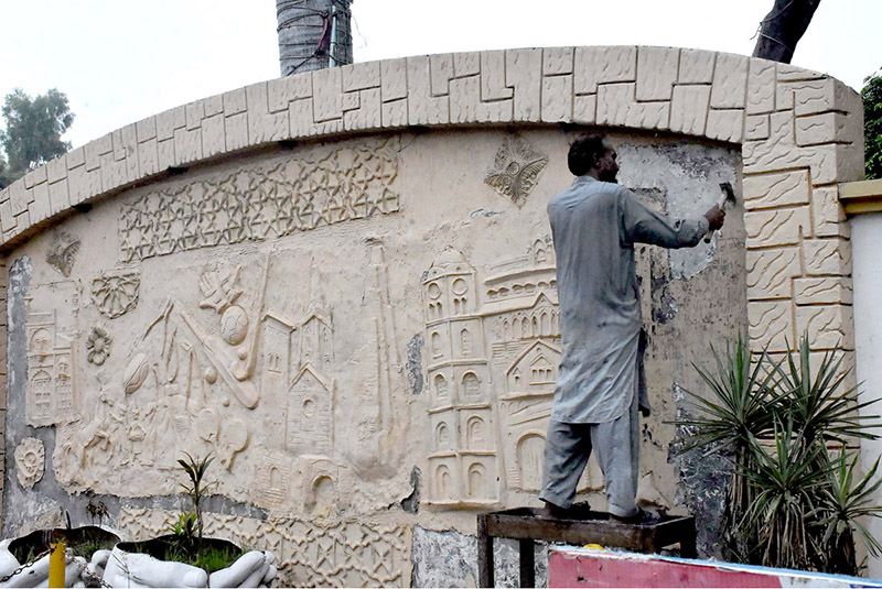 A skilled worker restores the intricate mural painting on the wall at Kachhari Chowk, bringing historical art back to life