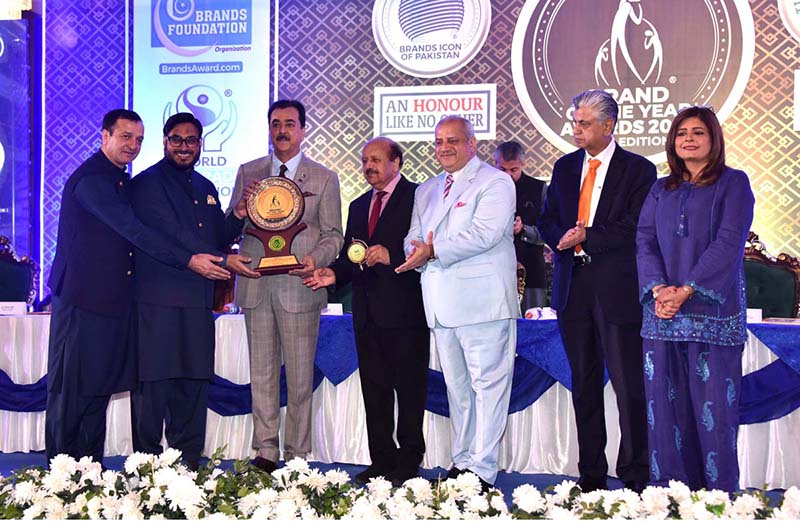 A souvenir is being presented to Chairman Senate, Syed Yousaf Raza Gilani by the organizer of the award distribution ceremony 16th edition of “Brand of the year awards 2025”