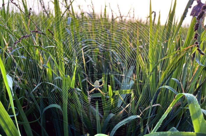 MULTAN: October 02 – A spider sits at the heart of its intricate web woven among green crops, as morning dew glistens like pearls on the fine silk threads in the soft light of dawn. APP/QSM/TZD/SSH