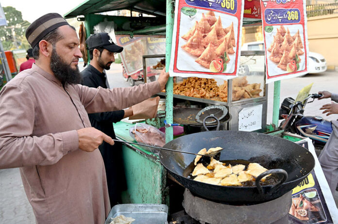 A street food vendor prepares samosas, a traditional food item for iftar, during the holy month of Ramadan