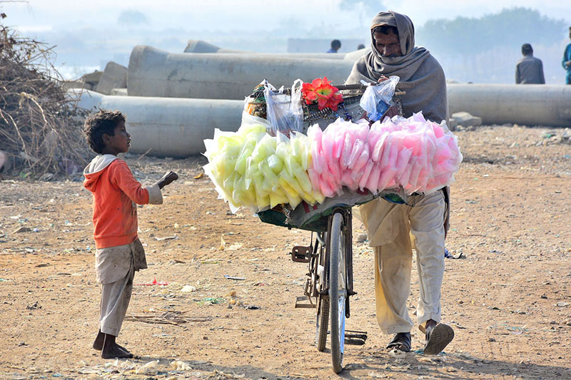 A street vendor on the way along with his bicycle loaded with cotton candy at Latifabad
