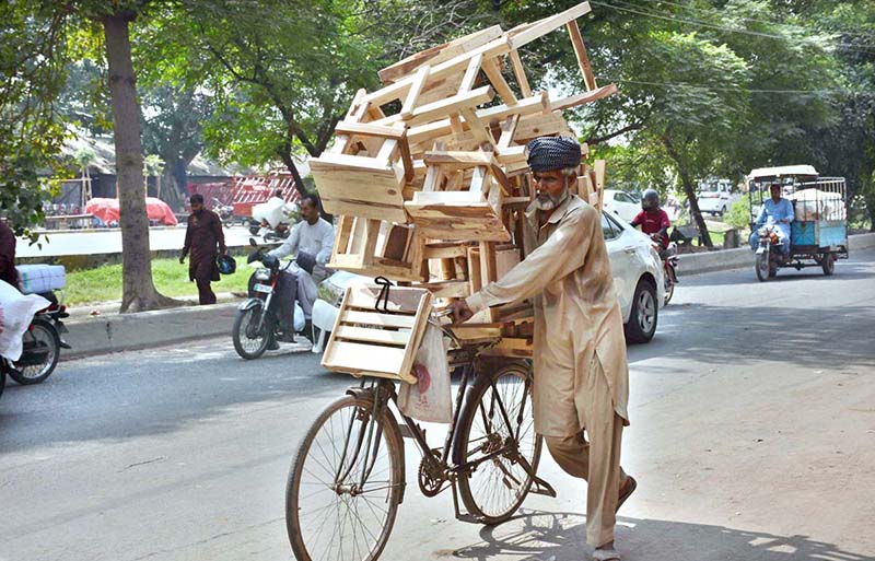 A street vendor pushes his bicycle loaded with handmade wooden stools, hoping to attract buyers on a hot afternoon in the city.