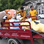 A street vendor sells fresh green guavas from his bicycle to a customer, tempting passersby at Shaheen Chowk. APP11-110825SARGODHA: August 11 – Previous Post A vendor displaying huge teddy bears on tricycle loader to attract the customers at his roadside setup Next Post A view of the Revenue Department building illuminated with colorful lights on the upcoming occasion of Independence Day celebrations.