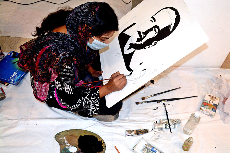 A student gives final touch to the portrait of Allama Muhammad Iqbal on his 147th Birth Anniversary organised by Knowledge Academy ofArts