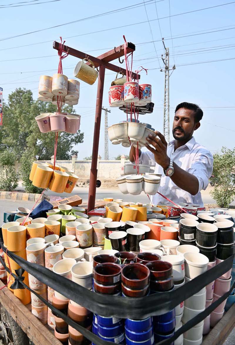A vendor arranges and displays teacups on his handcart to attract customers.