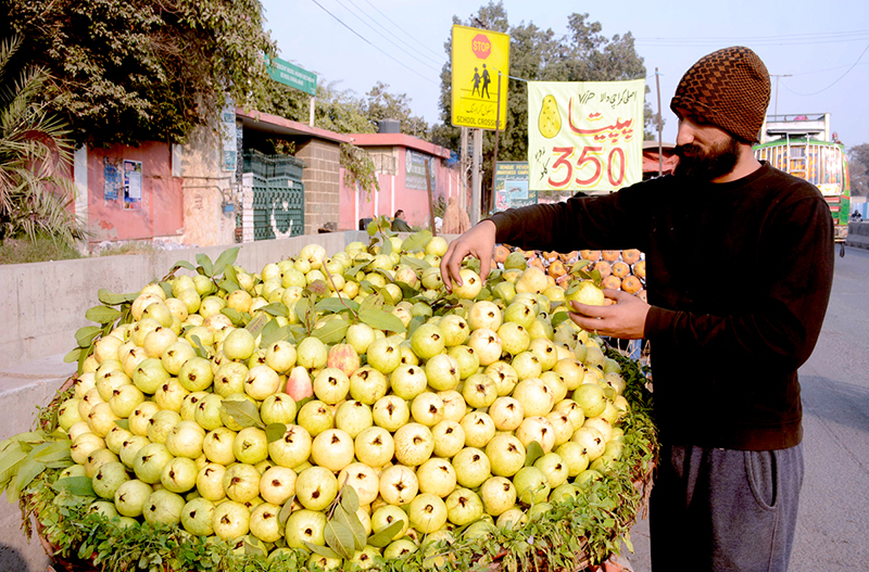 A vendor arranging and displaying the seasonal fruit (Guava) to attract customers at his roadside setup.