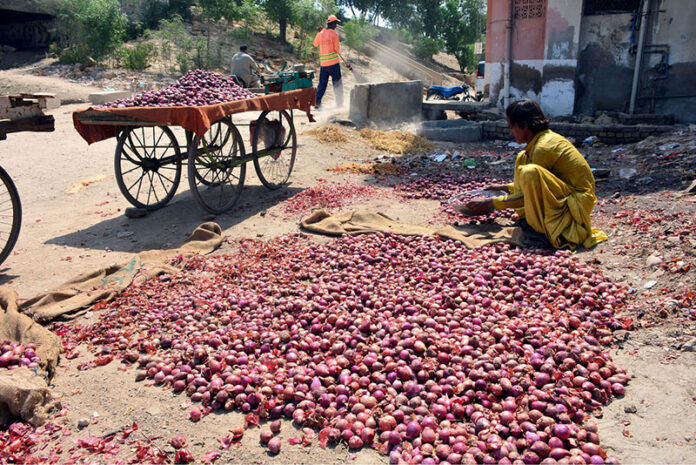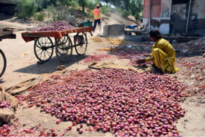 A vendor busy in sorting good quality onions for selling outside road at Latifabad