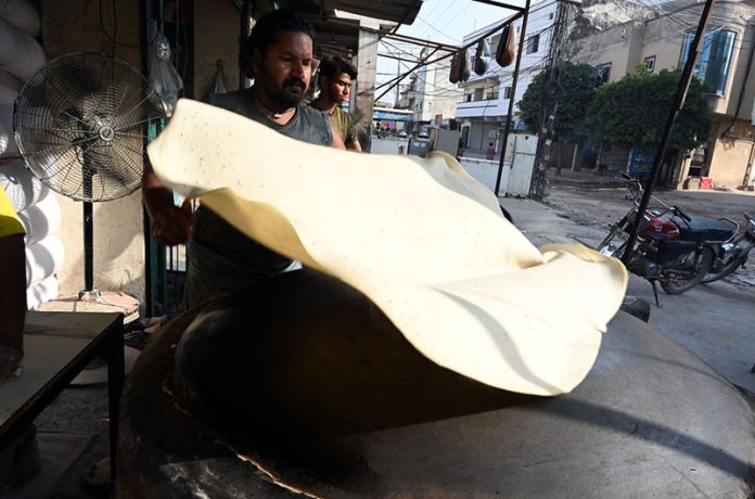 ISLAMABAD: October 19 – A vendor busy preparing large Manda Roti (Rumali Roti) and Samosa Patti at his roadside setup in Ghori Town. APP/SAK/FHA