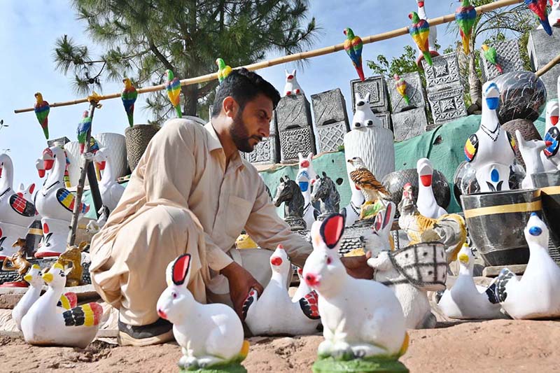 A vendor display beautiful plant pots and decoration pieces to attract customers at Chak Shahzad area in the Federal Capital