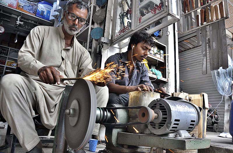 ISLAMABAD: June 28 – Blacksmith busy in shaarpen knives at his workplace to sell them to the butchers for using them to slaughter sacrificial animals during Eid-ul-Azha at G-9 Markaz. APP/SMR/TZDAPP27-280623