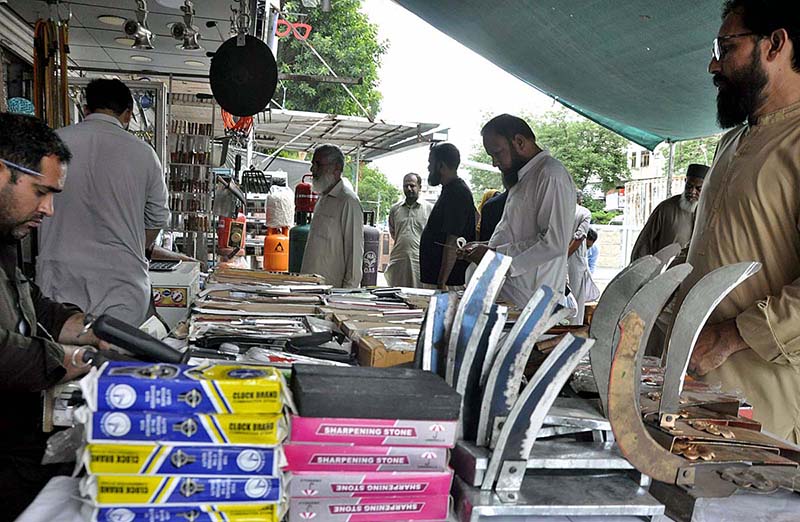 ISLAMABAD: June 28 – A vendor displaying knives to attract the customers at G-9 Markaz in connection with upcomming Eid-ul Azha. APP/SMR/TZDAPP28-280623