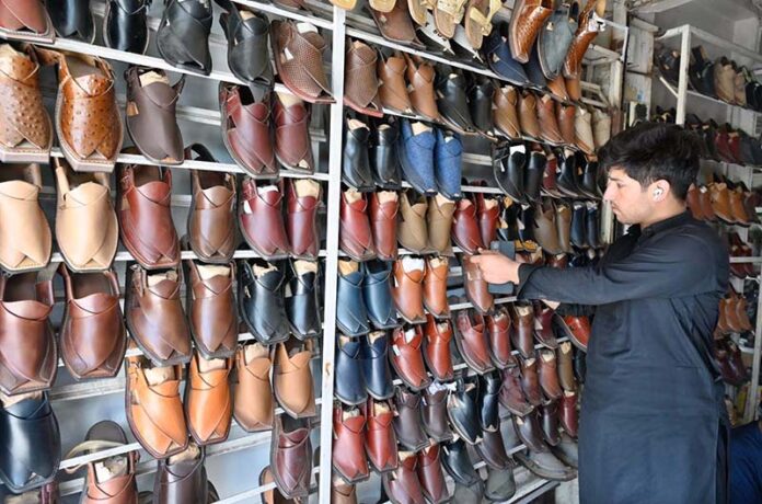 A vendor displaying and selling traditional Peshawari Chappal to attract customers at G-9 in the Federal Capital.