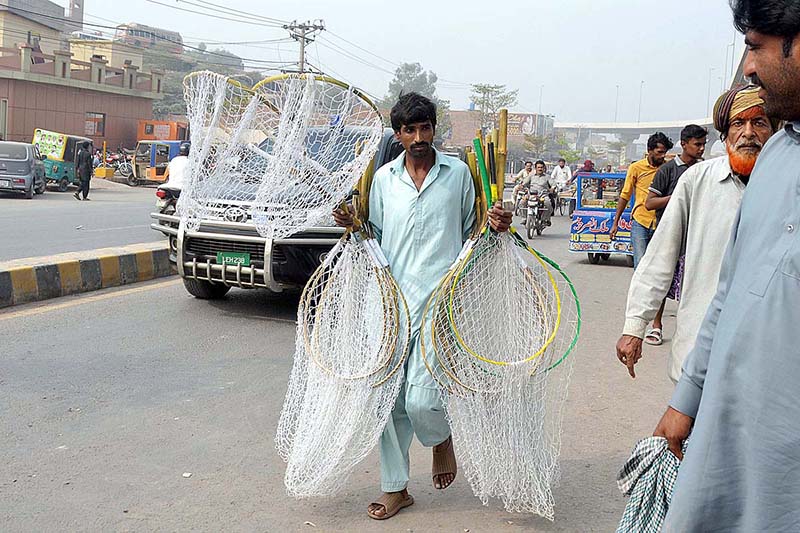 HomePhotosPhoto FeatureA vendor displaying birds catching nets to attract customers at Birds Market