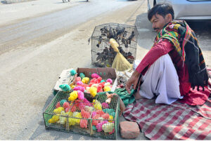 A vendor displaying chicks to attract the customers at Latifabad.