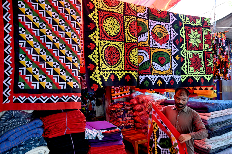 A vendor displaying handmade bed sheets to attract the customers at Jilis Bazaar