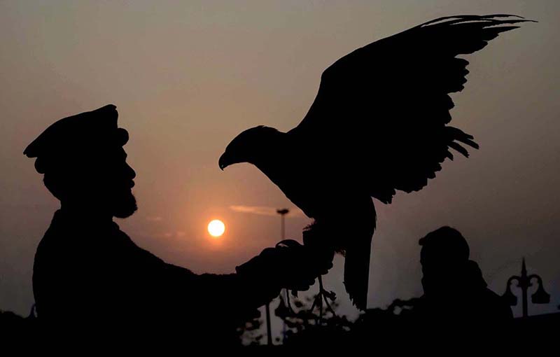 A vendor displaying his pet bird Eagle to attract the visitors for picture with at Lake View Park at Sunset Time