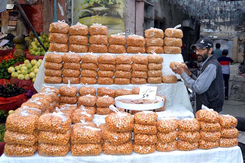 A vendor displaying ‘Pakoriyan’ to be used for ‘chaat’ to attract customers during holy fasting month of Ramazan