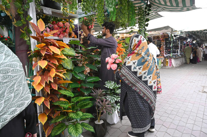 ISLAMABAD: May 02 – A vendor displays artificial plants to attract customers at the H-9 weekly bazaar in the Federal Capital. APP/SMR/ABB/FHA