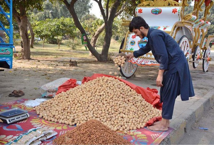 A vendor displays dry fruits on the footpath to attract customers at his roadside setup, as demand for dry fruits rises with the dropping temperatures in the city.