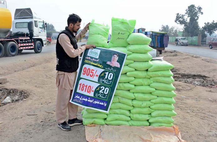 A vendor displays subsidized wheat flour bags along with a price list at a roadside stall under the Punjab government’s relief initiative.