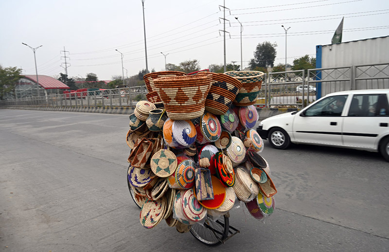 A vendor sells handmade items on his bicycle in the Federal Capital