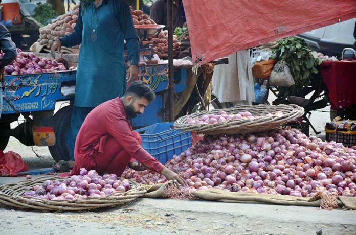 A vendor sorts and cleans fresh onions to attract buyers with the best quality at the vegetable market.