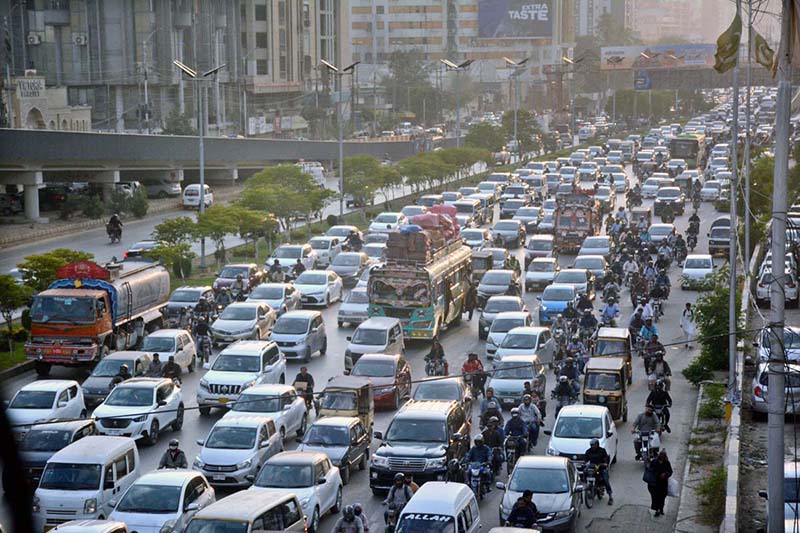 A view of a massive traffic jam on Shahra-e-Faisal, causing inconvenience to locals during peak hours in the provincial capital