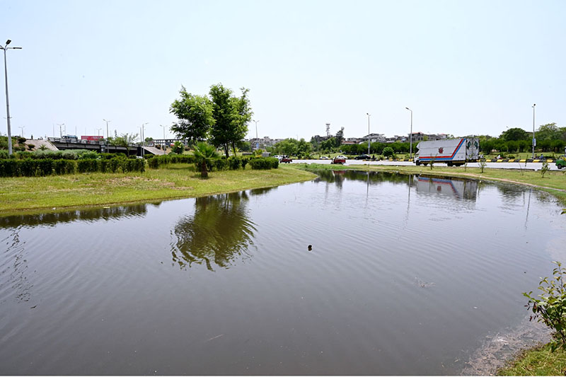 A view of accumulated rainwater after last night’s heavy rain at Faizabad Flyover in the Federal Capital
