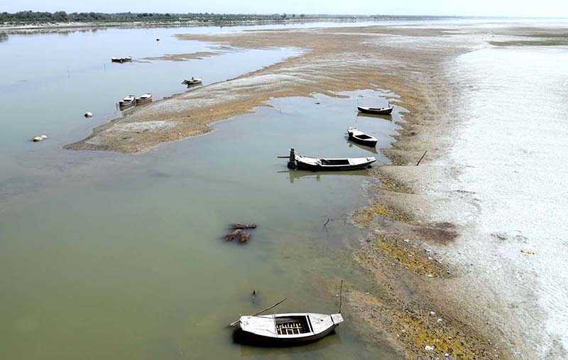 A view of boats parked at the Indus River near Larkana-Khairpur Bridge.