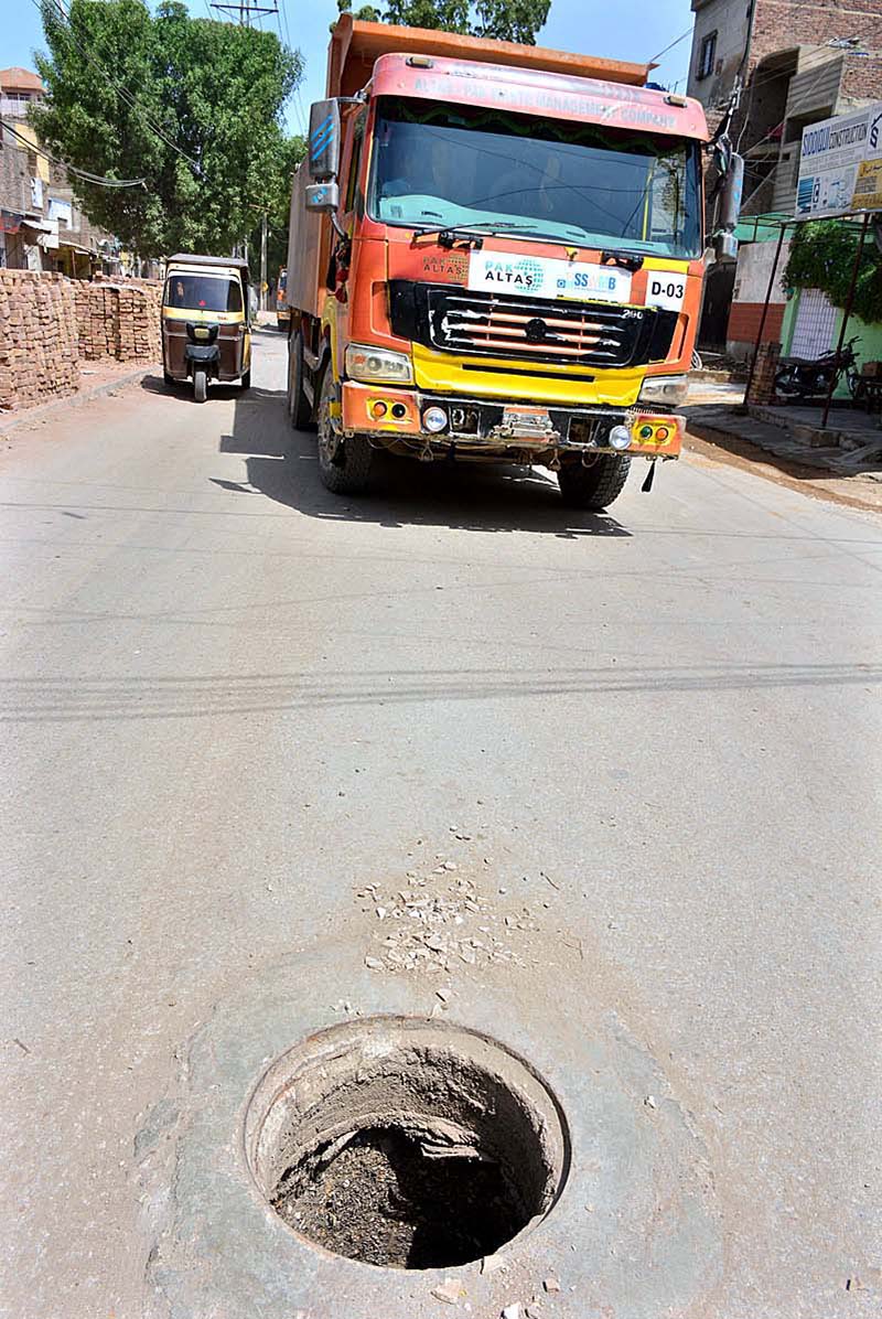 HomePhotosGeneral Coverage PhotosA view of open sewerage main hole on the road at Latifabad.