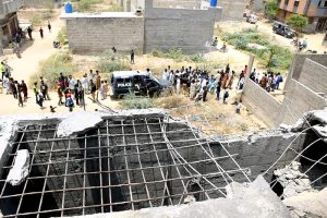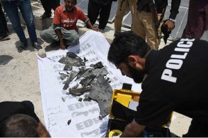 KARACHI: May 08 - A view of residents gathers as police personnel inspect the site where Pakistan shot down an Indian drone in the catchment of the city. APP/AMH/ABB