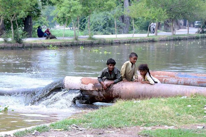 MULTAN: June 04 - A view of sewerage water dropping in the Canal making water polluted, creating environmental problems while gypsy children playing on the sewerage water pipe. APP/SFD/ABB/TZD