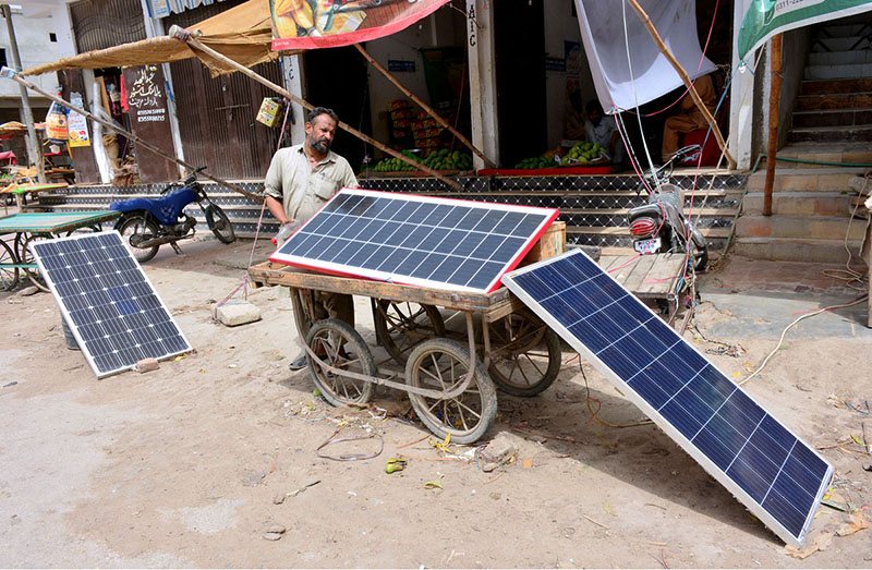A view of solar panels installed outside shop for providing a renewable energy source at fruit market