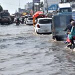 A view of stagnant rain water at old city area during monsoon rain in the metropolis. APP40-270824KARACHI: August 27 – Previous Post An eye catching view of rainbow appear over the city at sunset time. Next Post Vehicles and bikers make their way through heavy rain at Kotli Behraam .