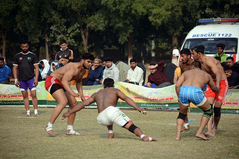 A view of the Kabaddi match played between Ittehad Kabaddi Club and Ali Shahanshah Kabaddi Club during Faisalabad Commissioner Gold Kabaddi Tournament at Bohran Wali Ground