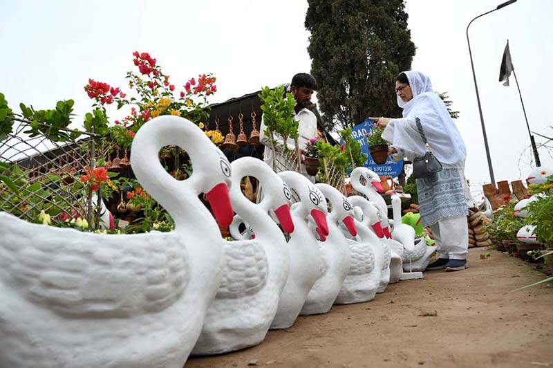 A woman customer selecting and purchasing plants from local nursery at Hayatabad.