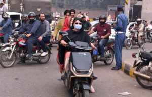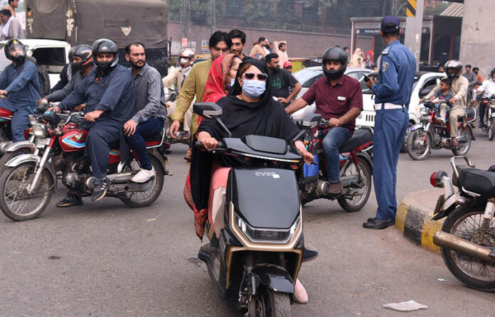 A woman rides an electric motorcycle towards her destination at Railway Station Chowk, wearing a mask to protect herself from the smog