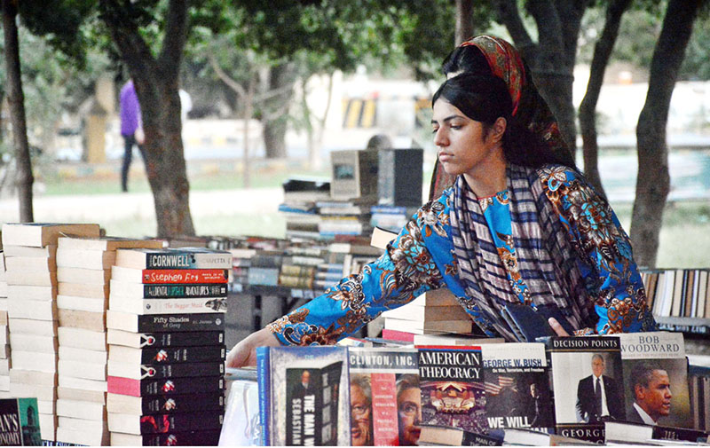 HomePhotosGeneral Coverage PhotosA woman selecting a book from old book stall setup in Frere...