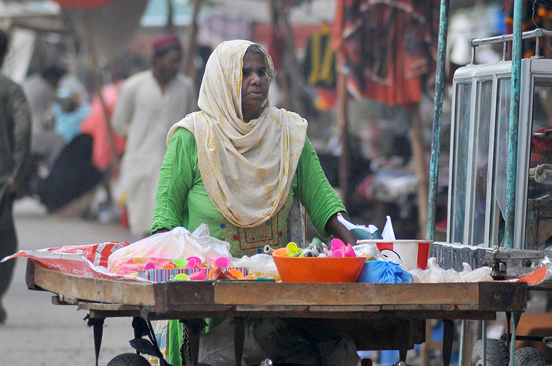 MULTAN: August 24 – A woman vendor displays toys to attract customers while shuttling on Shamshabad road to earn for livelihood.