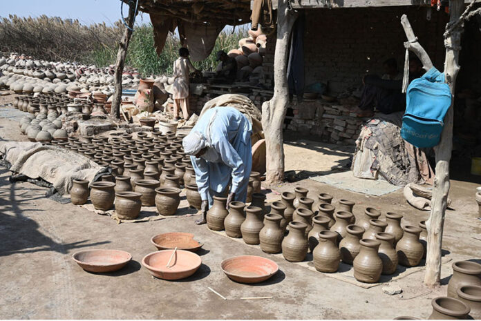 A worker arranging clay-made stuff for drying purpose at his work place in kumharpara.