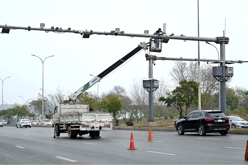 A worker busy repairing CCTV cameras during maintenance work at Srinagar Highway in Federal Capital