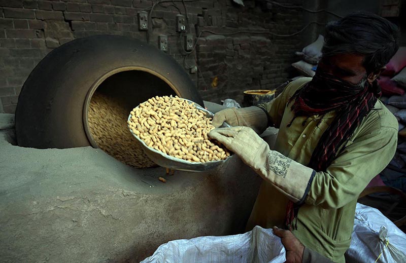 A worker roasts peanuts in a traditional oven for customers at his workplace in the provincial capital.