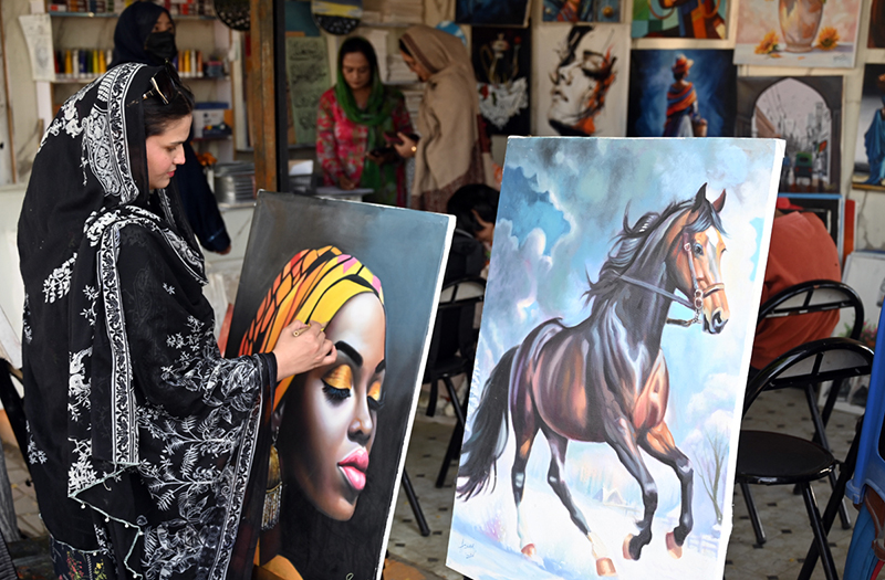 – A young female artist meticulously works on a landscape painting, showcasing her talent in public spaces. At H-9 Bazaar in the federal capital, creativity and artistry come alive for the community to enjoy.