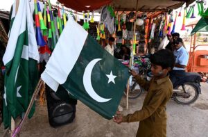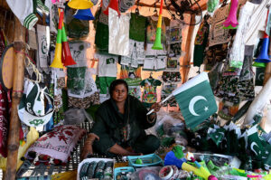 HYDERABAD: August 07 –A woman vendor sets up a stall fill with national flags, banners and patriotic items to attract enthusiastic citizens on the occasion of Independence Day on 14 August.