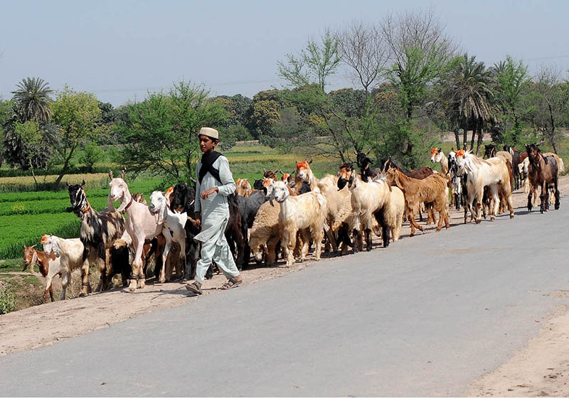 A young shepherd guides a herd of goats toward the field for grazing.