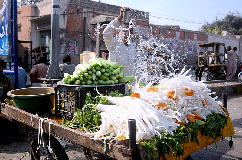 A young vendor showering water on the displayed radish to keep them fresh and attract the customers at his roadside setup