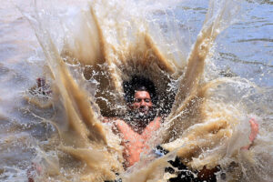 A youngster diving for bathing in water canal to get relief from hot weather in the city