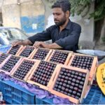 A youngster on the way along with bicycle loaded with nests for selling at Khayam Chowk. APP09-030624SARGODHA: June 03 – Previous Post Lady Health Worker administering polio drops to a child during anti polio campaign in the city. Next Post A vendor arranging and displaying seasonal fruit ‘cherry’ on his cart to attract the customers.